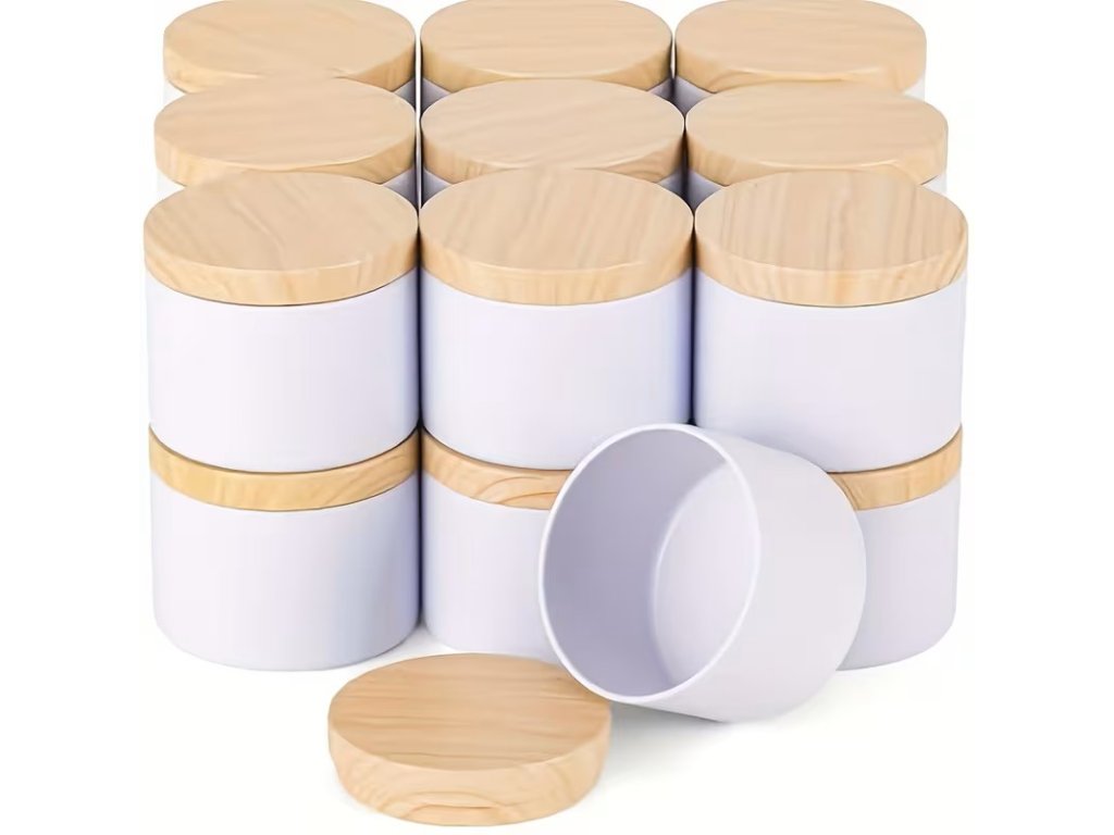 Elegantní kovová nádoba na svíčku v bílé barvě s víčkem imitací dřeva je ideální volbou pro DIY výrobu svíček, skladování drobností nebo jako stylový obal na ručně vyráběné dárky. Minimalistický design se hodí do každého interiéru a působí čistě a profesionálně.
