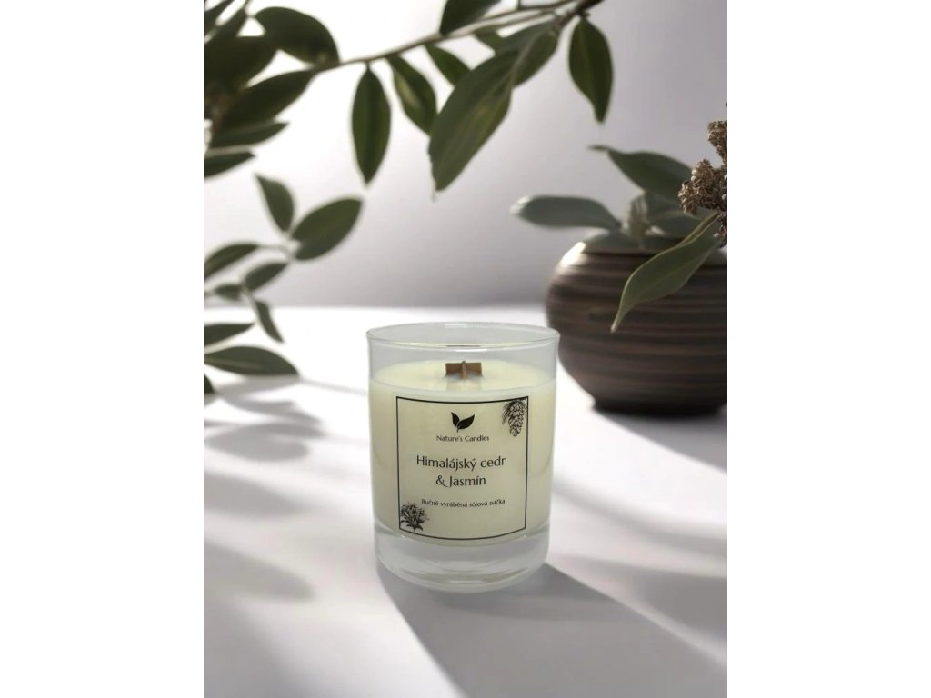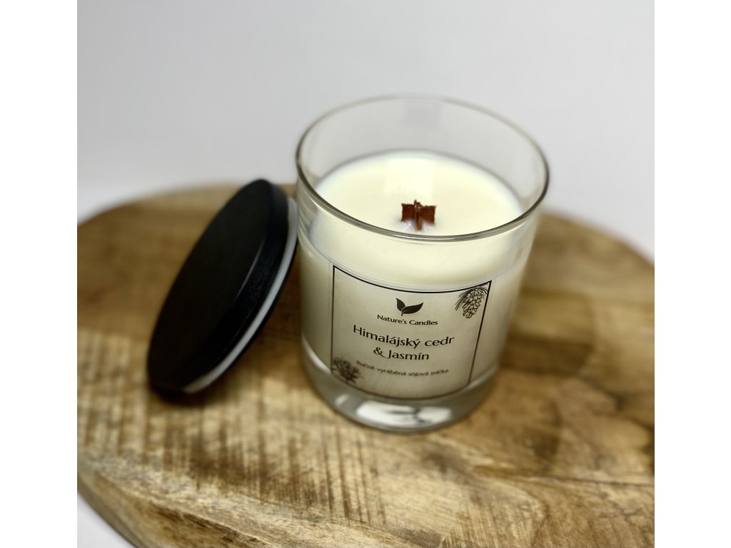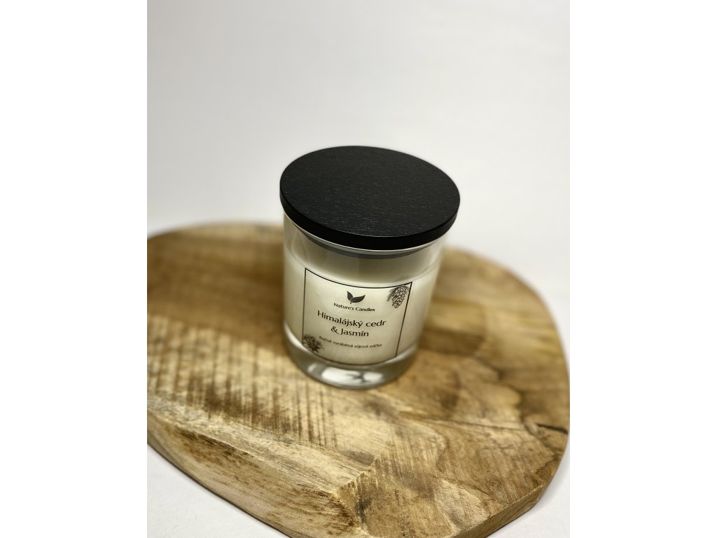 Sójová svíčka s vůní Himálajský cedr & Jasmínu, citrusové svrchní tóny vedou od srdce exotického jasmínu smíchaného smíchaného s bílými květinami, hladkým jantarem a suchým cedrovým dřevem, pačuli, vaničkou a pižmem.