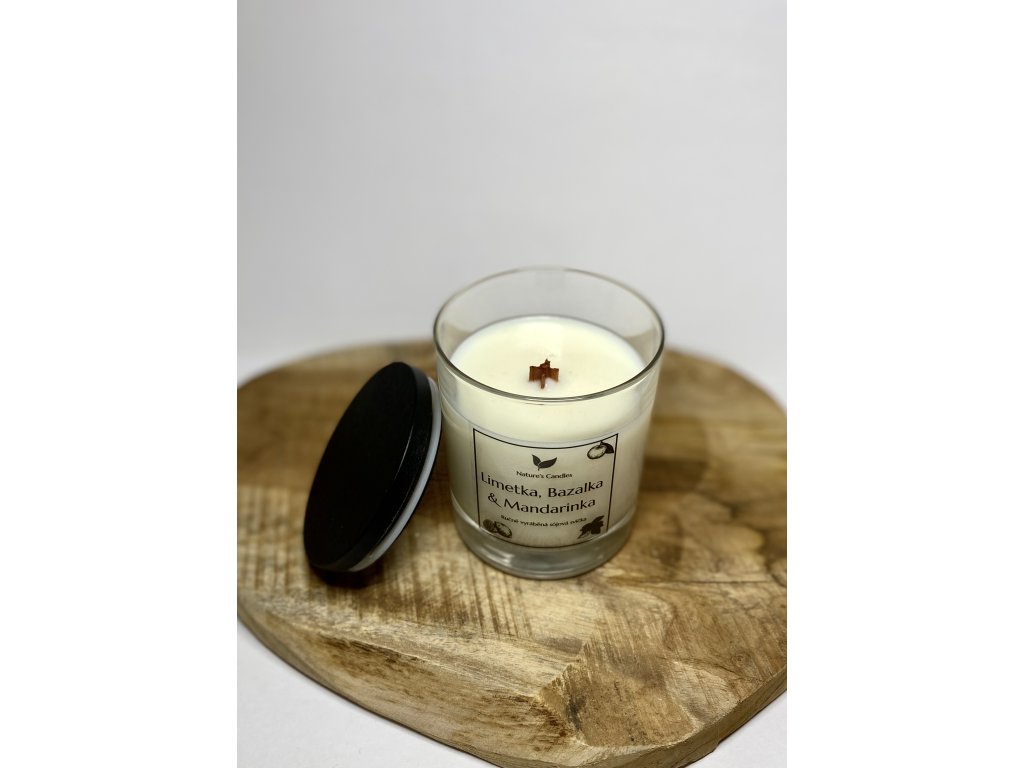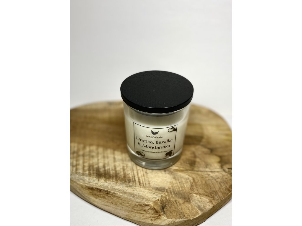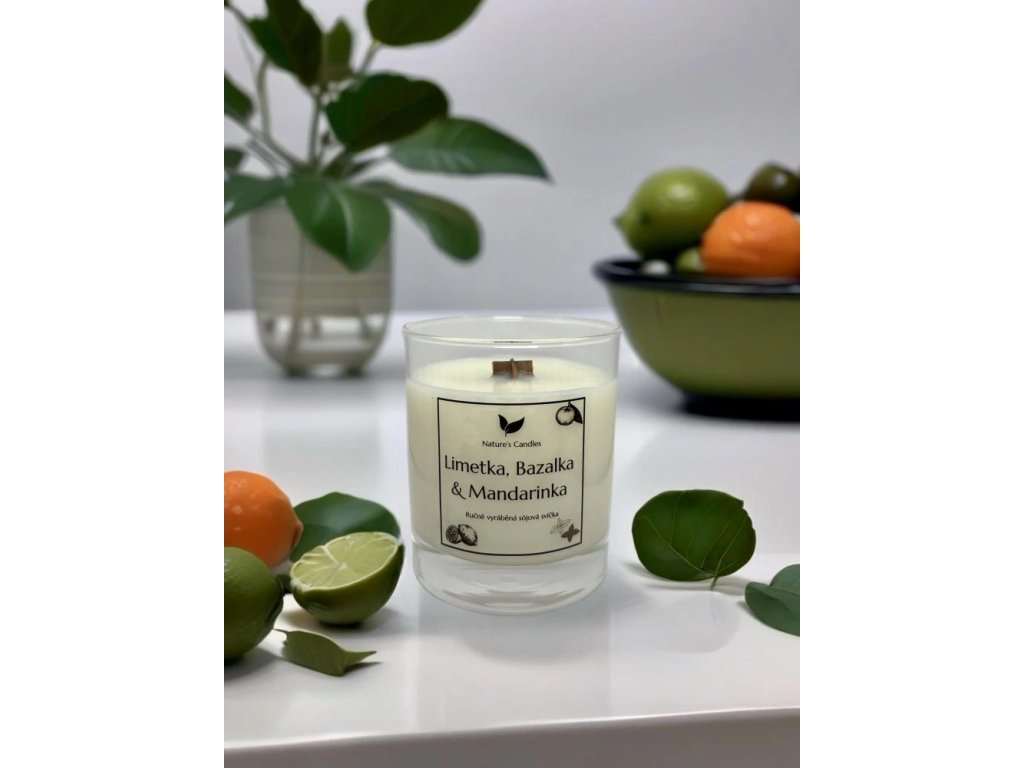 Sójová svíčka s vůní Limetky, Bazalky & Mandarinky, lákává lahodná směs sicilské limetky, bergamotu, v srdci se zralou mandarinkou, bílými květy a bazalkou.
