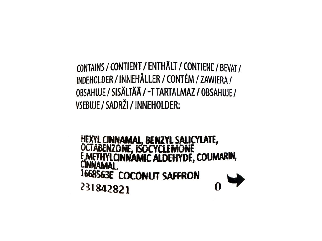 Obsah nebezpečných látek: Hexyl cinnamaldehyde; Benzyl salicylate; Isocyclemone E; alpha-Methylcinnamaldehyde; Kumarin; Cinnamal